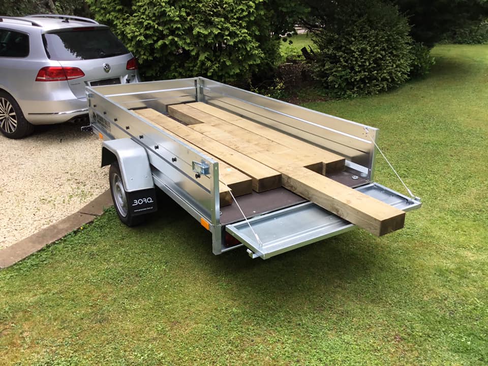 The Boro Utility trailer is a single unbraked axle tipper, overall dimensions are; 325x170x100cm with a permitted laden weight of 750kg. Load area dimensions are; 205x125x44cm with a load capacity of 570kg. All sides hinged for easy access.